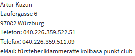 Sie haben das jederzeitige Recht, sich unentgeltlich und unverzüglich über die zu Ihrer Person erhobenen Daten zu erkundigen. Sie haben das jederzeitige Recht, Ihre Zustimmung zur Verwendung Ihrer angegeben persönlichen Daten mit Wirkung für die Zukunft zu widerrufen. Zur Auskunftserteilung wenden Sie sich bitte an den Anbieter unter den Kontaktdaten im Impressum.